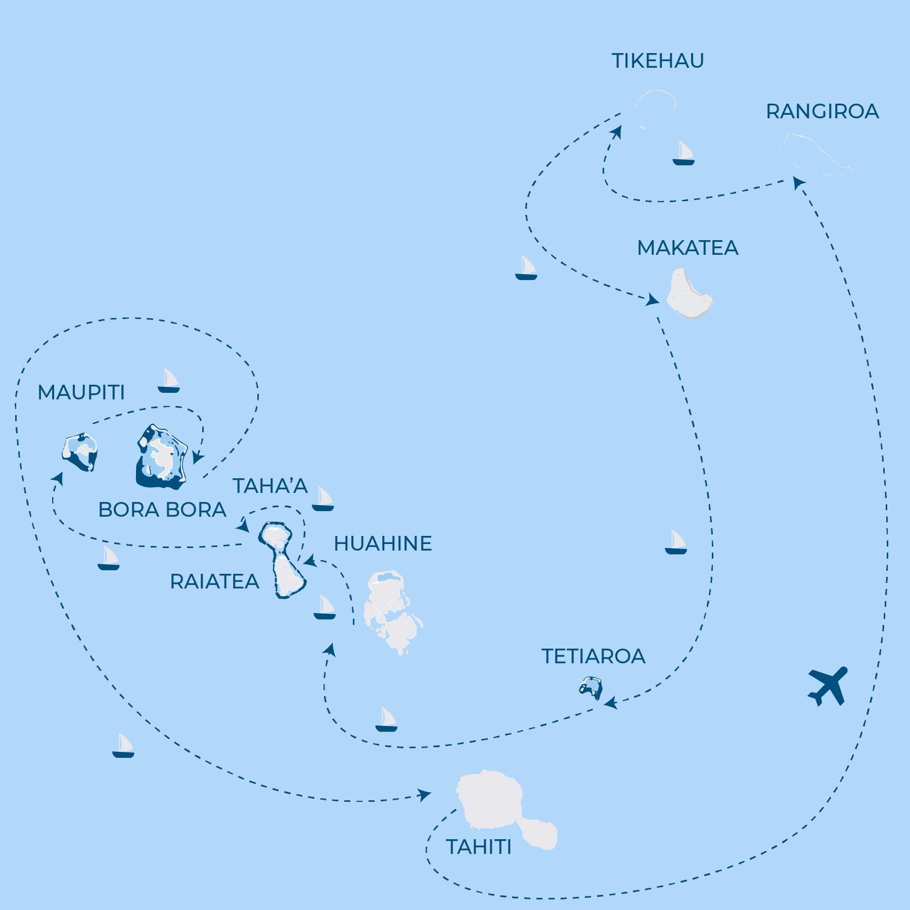 9 îles ou atolls visités : Tikehau – Makatea – Tetiaroa – Huahine – Raiatea – Taha’a – Maupiti – Bora Bora